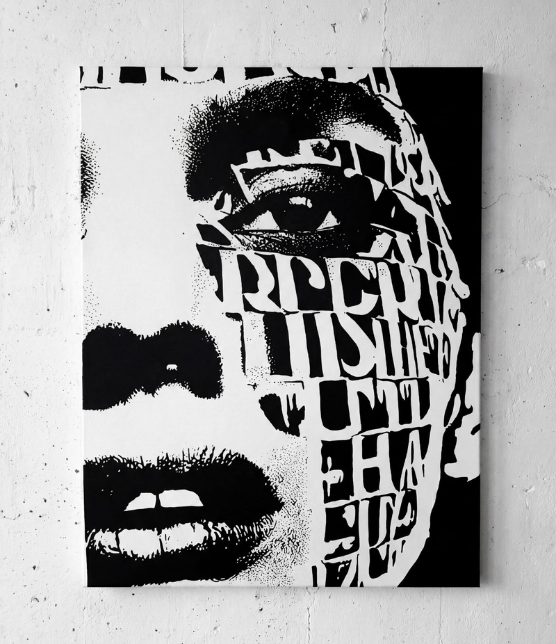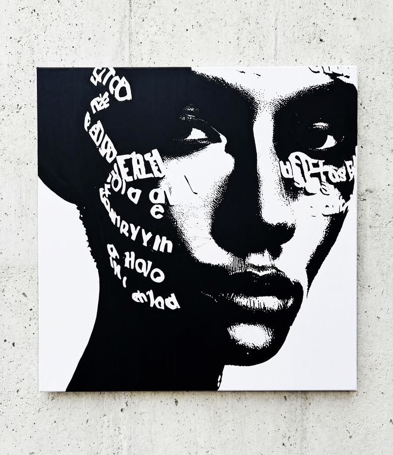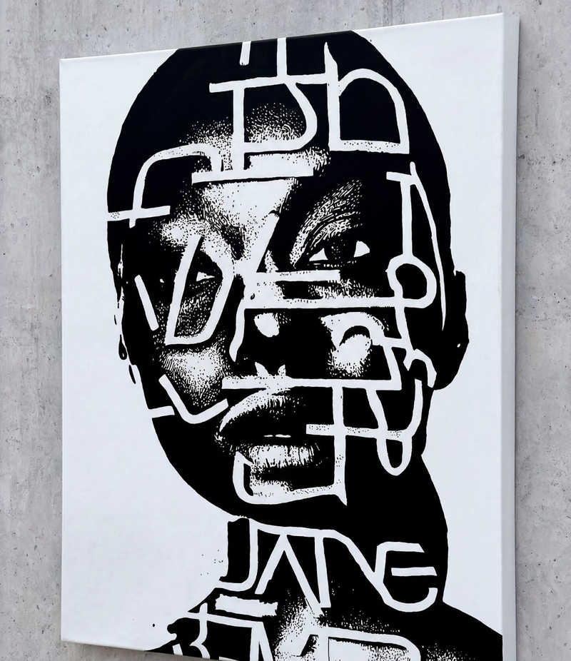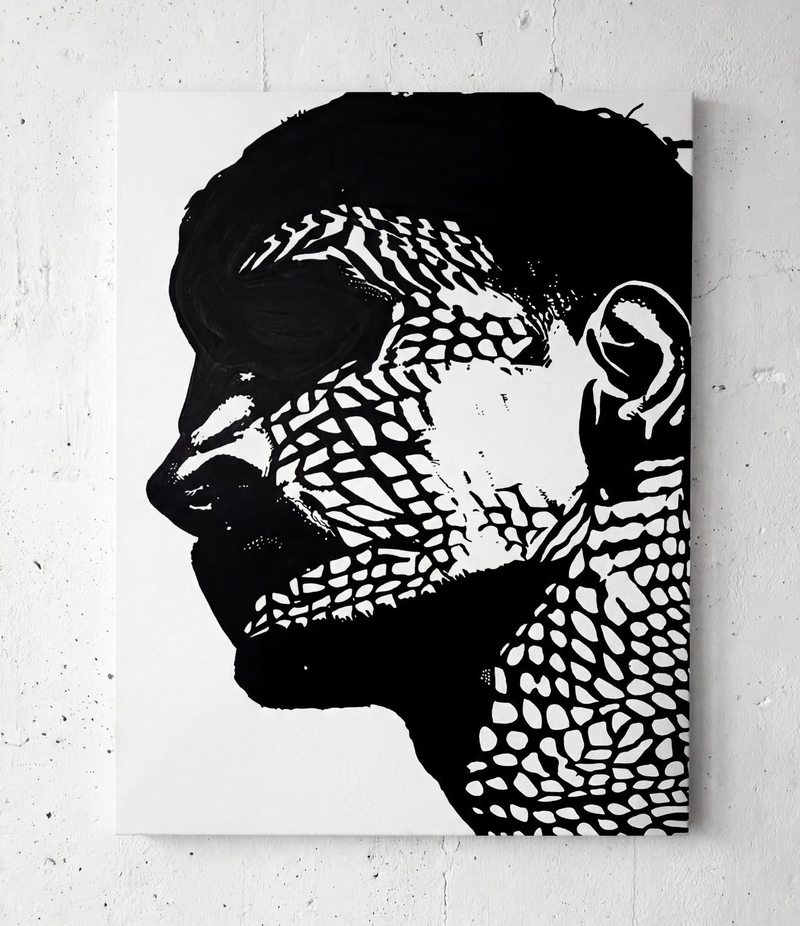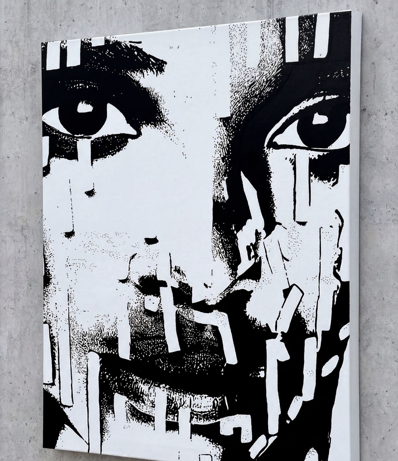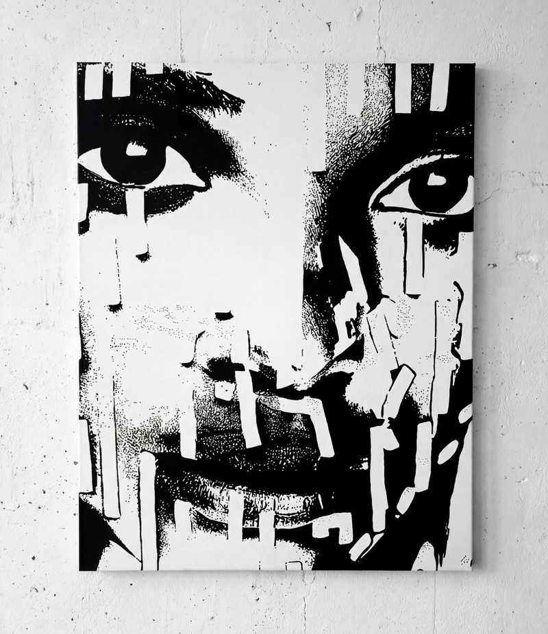 TRANSLATING TESTIMONY. THEIR FACES CARRY UNREADABLE MAPS. I INSCRIBED THOSE MAPS AS LINES, I WORK PHOTOGRAPHICALLY—THE CAMERA AS AN INSTRUMENT OF LISTENING. EVERY PORTRAIT IS CREATED THROUGH THE INTERPLAY OF PROXIMITY AND RESPECT. I PHOTOGRAPH, STUDY LIGHT, STRUCTURE, POSTURE. THEN I TRANSFER THE IMAGE TO CANVAS, WORKING WITH ACRYLICS, BRUSHES, FINGERS, AND CLOTHS UNTIL THE FACE REGAINS ITS SKIN. LINES BECOME VEINS, COLOR BECOMES BREATH. EVERY FINISHED WORK, LIKE ALL MY SERIES, HAS A UV COATING.