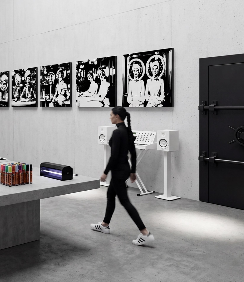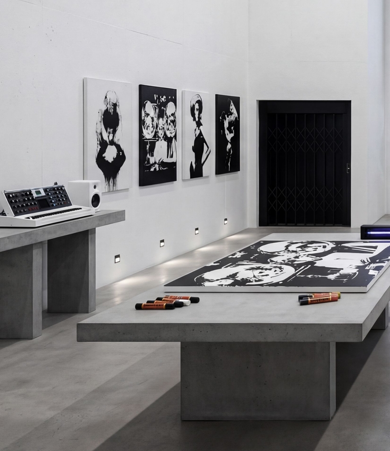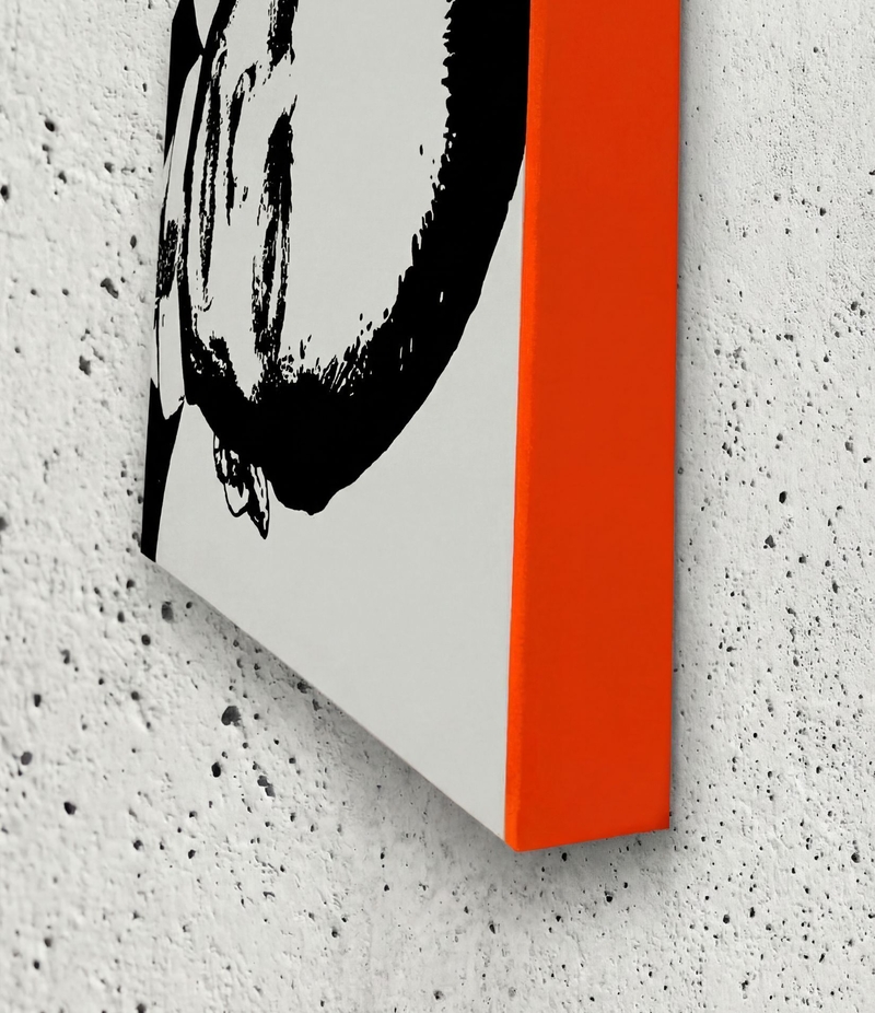 JAZZ, HIP HOP, THE GRIT OF STREET-STYLE FROM LONDON OR NEW YORK, AND A HANDSHAKE WITH HAUTE COUTURE FROM PARIS – THIS IS MY SET. MY MINDSET, TRANSLATED THROUGH FREQUENCIES, IS THE FEED OF MY MONOLITHS. I DO IT ALL MYSELF. I SCOUT MY INDIVIDUALS OR I CREATE THEM. I SEW THE CLOTHES, CREATE THE SETTING, BEFORE THE FIRST STROKE EVEN TOUCHES THE CANVAS. BLACK-AND-WHITE WORKS. REDUCTION IS COMPRESSION. ACRYLIC, INK, 24K GOLD, CONCRETE. I AM IN LOVE WITH SUBSTANCE, WEIGHT, AND THE LONG-TERM – NO TRENDS! REALNESS & AUTARKY. SIMPLY PUT: DON’T FUCK WITH MY TIME! MY ART PROVIDES ENERGY. MY FRAME-SETTINGS CAGE IT. AND THE UV-VARNISH? A SUBTLE REMINDER THAT PERCEPTION IS NEVER COMPLETE. TAKE IT OR LEAVE IT.